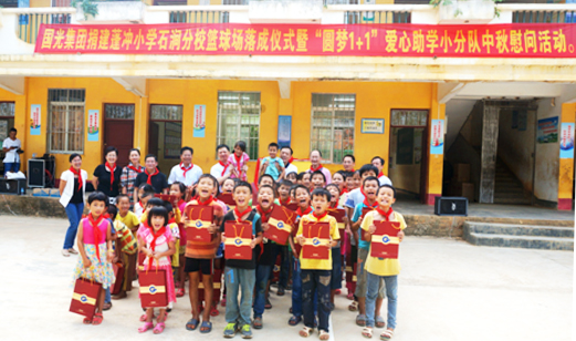 圖:2015年9月17日,梧州市長(cháng)洲區蓬沖小學(xué)石澗分校的孩子手捧國光黨委送來(lái)的中秋月餅,在國光捐建的籃球場(chǎng)快樂(lè )地合照留影