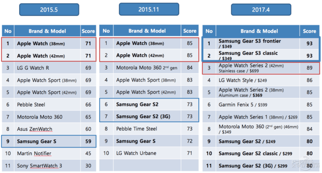 大家可以從上面的表格里看到這19款產(chǎn)品的前10款排名以及對應的得分,三星Gear S3的兩個(gè)版本分列前兩名,隨后是蘋(píng)果、LG、佳明等,而且有趣的是,前兩款三星Gear S3的價(jià)格(350美元,稅前)僅為第三名Apple Watch Series2(不銹鋼版)的一半(700美元,稅前),于是我們比較好奇該機構對這些產(chǎn)品的具體評分是怎樣的?