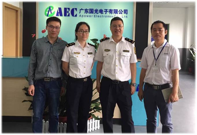 5月23日上午11:00,花都出入境檢驗檢疫局科長(cháng)一行到國光電子進(jìn)行鋰電池質(zhì)量檢驗政策解讀、交流,并參觀(guān)了國光電子制樣室、檢驗室及成品倉庫,隨機抽取部分鋰電池進(jìn)行檢驗。交流過(guò)程由國光電子質(zhì)管部經(jīng)理廖貴方、關(guān)務(wù)專(zhuān)員姚世軍及認證工程師蔣瑞瑞陪同。